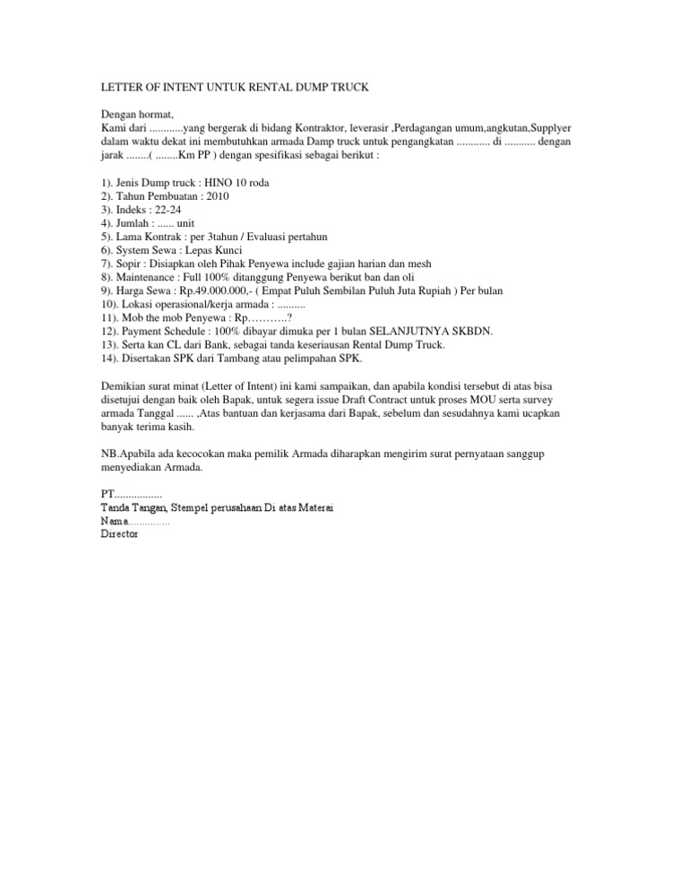 Letter of intent untuk rental dump truck. Surat minat — loi : Contoh surat tunjuk minat menjadi sub kontraktor. Letter of intent with the sellers. Draft loi letter of intent.docx.